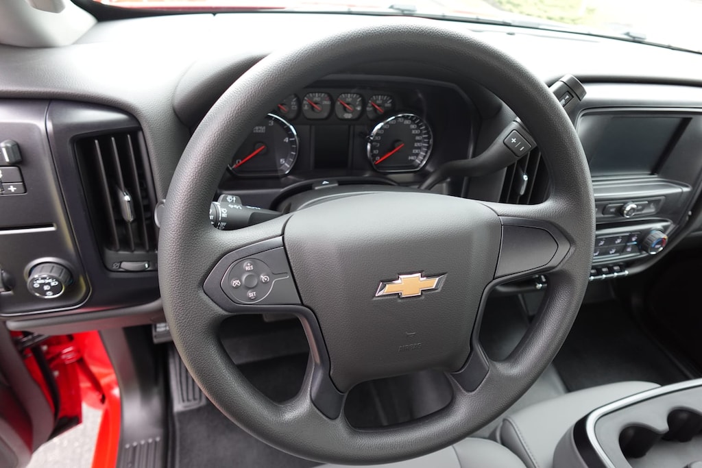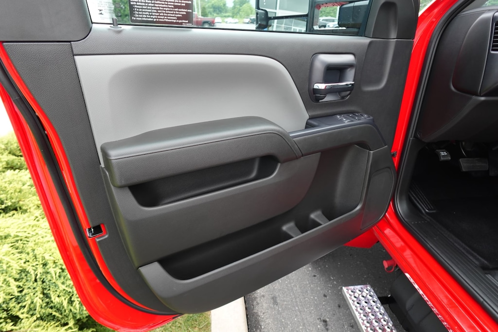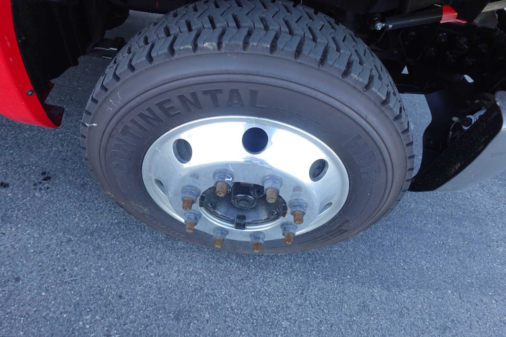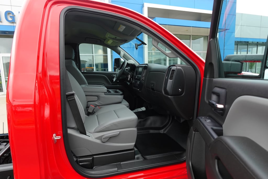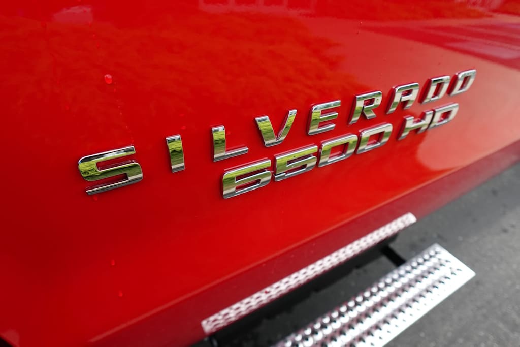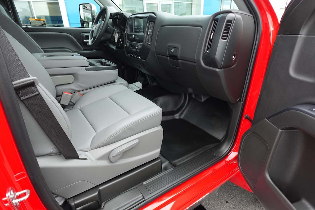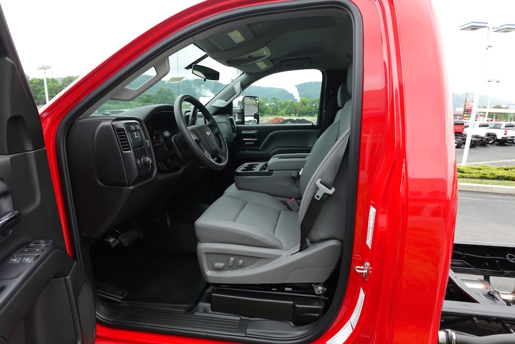 WHEELS, 19.5 X 6.75, 6-ALUMINUM WHEELS, 8-HOLES, HUB PILOTED Dura-Bright finish is on the outside of the wheel, RUGGED DUTY SERVICE TRANSMISSION, AUTOMATIC CLOSE-RATIO 6 SPD WITH DOUBLE OVERDRIVE, ALLISON, A2750RDS ratios: 3.10 1ST, 1.80 2ND, 1.40 3RD, 1.00 4TH, 0.70 5TH, 0.61 6TH Rugged Duty Series, includes park pawl, SEATS, FRONT 40/20/40 SPLIT-BENCH, CLOTH OR VINYL 3-PASSENGER. Includes driver and front passenger recline with outboard head restraints and center fold-down armrest with storage. Also includes manually adjustable driver lumbar and storage pockets. Includes (AG1) 10-way power seat.), AXLE, LIMITED SLIP, DANA SPICER TRUETRAC, TORQUE PROPORTIONING LIMITED SLIP, MIRRORS, OUTSIDE HEATED POWER-ADJUSTABLE VERTICAL TRAILERING, UPPER GLASS, MANUAL-FOLDING AND EXTENDING, BLACK. Includes integrated turn signal indicators consisting of 51 square inch flat mirror surface positioned over a 24.5 square inch convex mirror surface with a common head and lower convex spotter glass (convex glass is not heated and not power adjustable) and addition of Auxiliary cargo lamp for backing up (helps to see trailer when backing up with a trailer) and amber auxiliary clearance lamp, WINDOWS, POWER WITH DRIVER EXPRESS UP AND DOWN AND EXPRESS DOWN ON ALL OTHER WINDOWS, AUDIO SYSTEM, 7 DIAGONAL COLOR TOUCH-SCREEN WITH CHEVROLET INFOTAINMENT AM/FM stereo with seek-and-scan and digital clock, includes Bluetooth streaming audio for music and select phones. Includes (UQ3) 6-speaker audio system. ASSIST STEPS, ALUMINUM, REMOTE KEYLESS ENTRY, ENGINE, DURAMAX 6.6L TURBO-DIESEL V8, B20-DIESEL COMPATIBLE 350 hp @ 2700 rpm, 700 lb.-ft. torque @ 1600 rpm (STD). Electronic Stability Control, Vinyl Seats, 4-Wheel ABS.